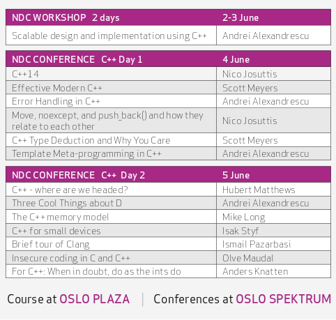 See the full agenda at ndcoslo.com, especially Wednesday and Thursday. I’ll be talking about ints. If you think that sounds like a narrow topic, rest assured there’ll be a char too! Oh, and a secret tip, if you’re a member of Oslo C++ Users Group, contact me for a discount!